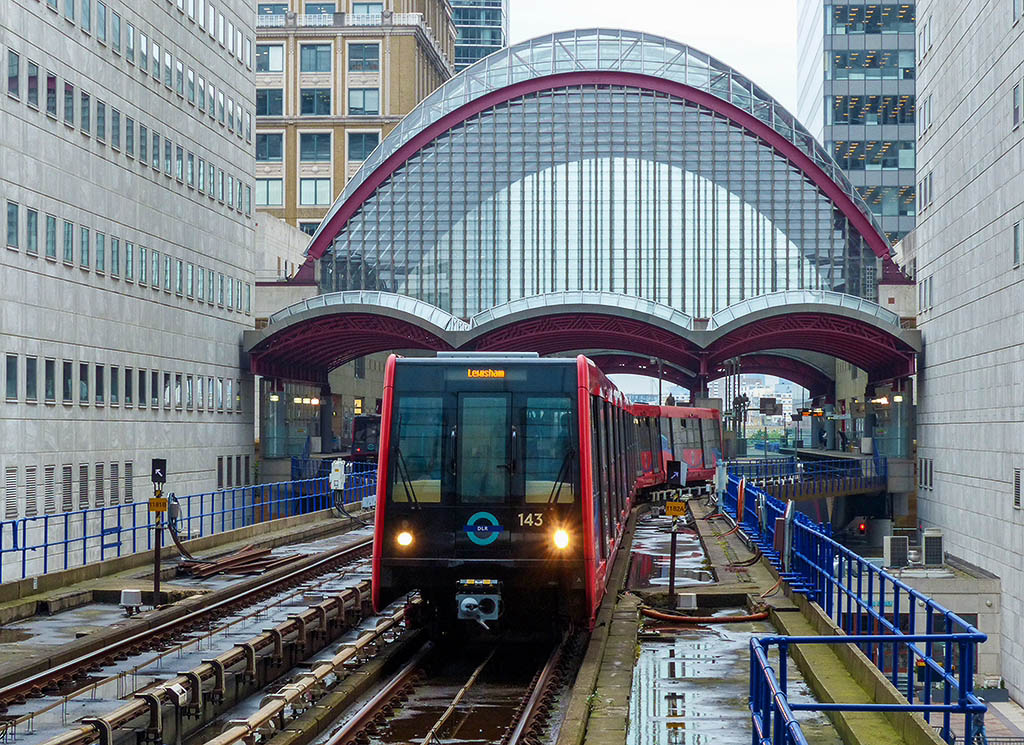 DLR: train leaves Canary Wharf, heading for Heron Quays
