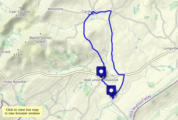 We’re exploring the lanes between the Wenlock Edge and the Stretton Hills. Although they’re barely two miles apart, Rushbury lies beneath the Edge, while Willstone Hill’s Battle Stones and Caer Caradoc define Cardington. They may be quiet, but the villages feel prosperous, and Cardington’s Royal Oak is the archetypal English pub (no, not today…). Walking anticlockwise from Wall-under-Heywood, we reach the highest point on our route as we pass – and we’d better visit – the Sharpstones, where rocks poke out of the hilltop pasture. From there it’s all downhill…