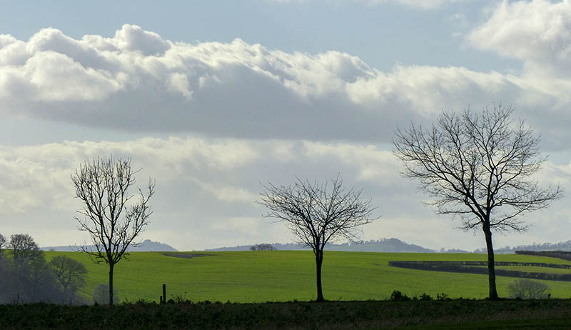 Three trees and two hills