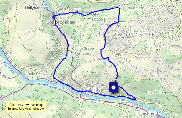 The visit to the toy shop in Ironbridge was planned in advance (a birthday is on the near horizon). We’ll make a walk of it – up the hill and past Woodside to pick up the path (a former plateway) beside the railway. Passing through the museum yard, the lights are on the tea shop – are we going to be tempted?
