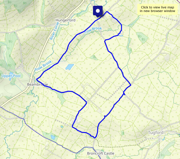 We start near Tigger’s Ickle Shop (see Holdgate and Rowe Lane) – and we’re there in the nick of time, for as we select one or two tasty-looking items, a horde of noisily-chattering locusts (thirty or more, all dressed as walkers) descends eagerly upon the roadside stall. Minutes later, we’re heading in the opposite direction (by choice) and it’s quiet along Rowe Lane, with good views to left and right from this minor ridge. Rowe Lane was once the main way along Corvedale, and a mile or so later, we’re following another old way – a narrow stream that pretends to be a footpath. Having survived the particularly muddy last few yards of this path (where our spirits are lifted by the call of a curlew), we’re back onto good surfaces, for the track past the remarkable moated farmhouse at Thonglands. A very pleasant wander in a quiet corner of the county.