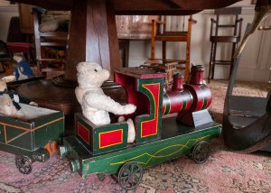 There’s a bear driving a train under the table