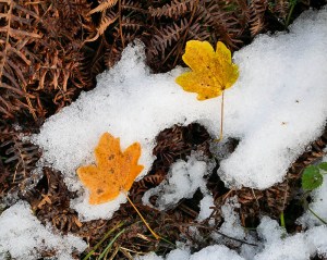 Fallen leaves and a small patch of snow