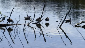 Geese on a fallen tree