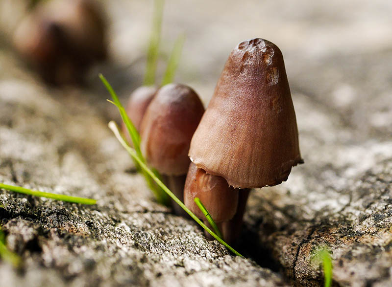 Tiny toadstools on fallen wood