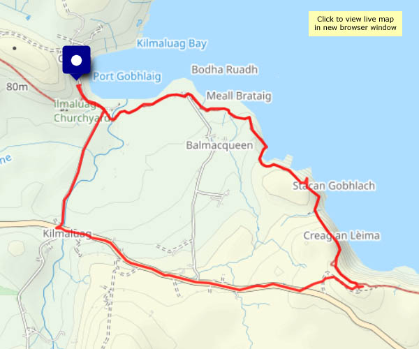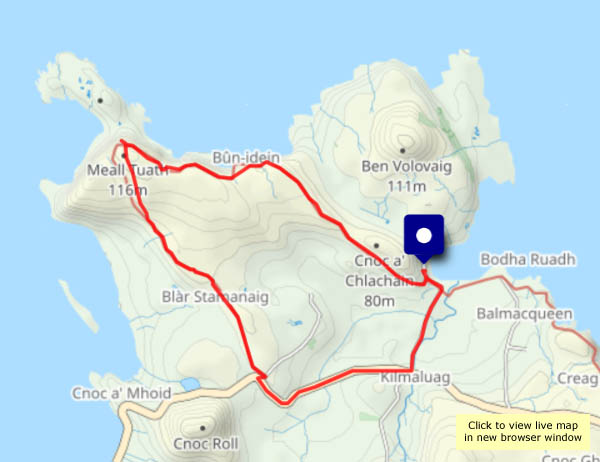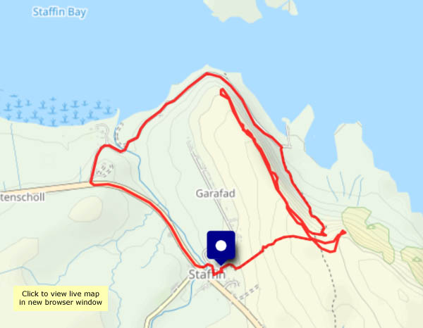 I believe it was a TV programme? No, this is a walk on the north side of Uig bay, via Idrigill to the headland of Creagile. Along the way, there are good views of the pier and the Hebrides, loading for its departure to Tarbert, Harris. Up on the headland, there’s a stiff breeze – the views may be great, but it’s not easy to hold the camera still.